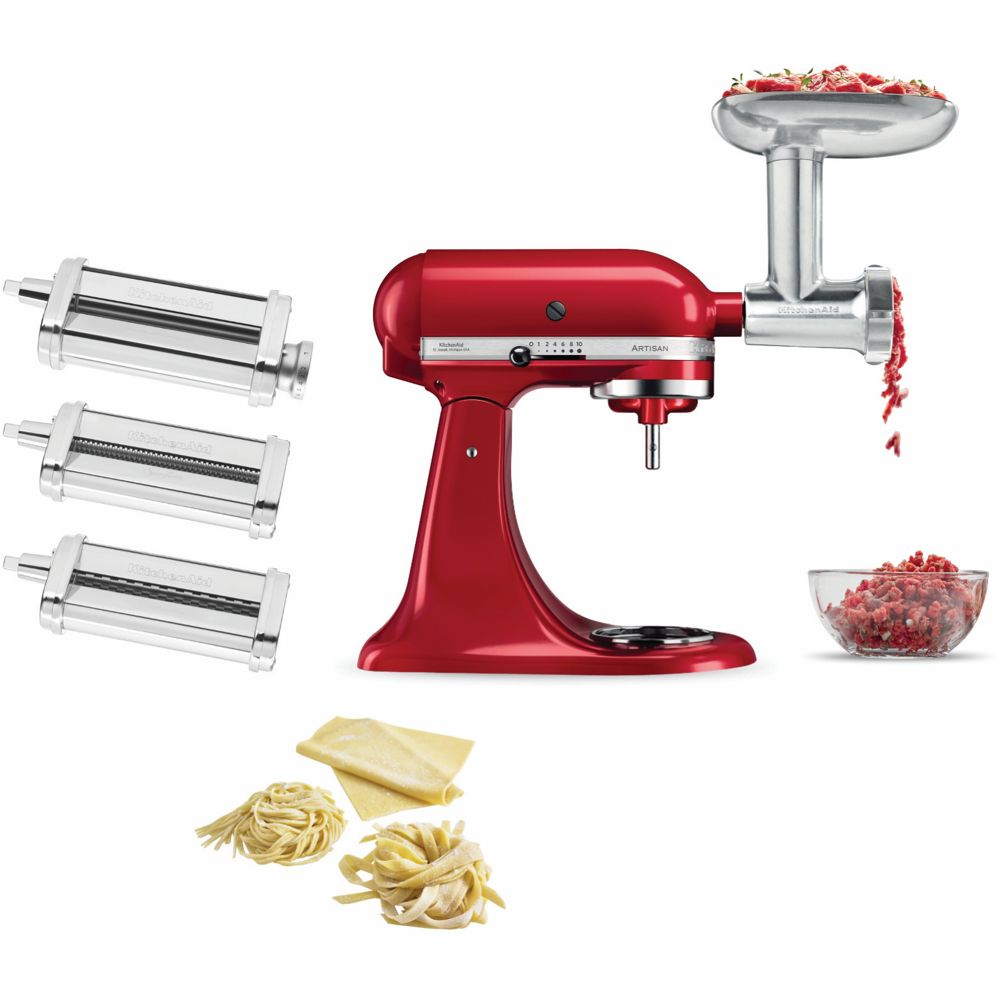 Questi ingegnosi accessori per la preparazione della pasta sono perfetti per qualsiasi planetaria KitchenAid, vecchia o nuova che sia. Sono progettati in modo intelligente per adattarsi a tutti i nostri modelli di planetaria. Basta fissarli all'attacco per accessori multifunzione per iniziare subito a preparare la pasta.